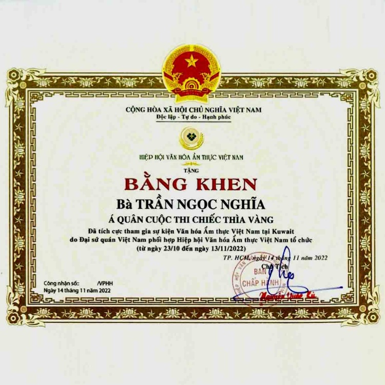 - Bằng khen của Hiệp hội Văn Hóa Ẩm Thực Việt Nam về quảng bá ẩm thực cùng Đại sứ quán tại Cô-Oét