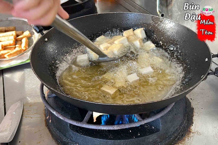 🧈 Đậu phụ rán – lớp vỏ vàng giòn, ruột mềm béo: Đậu được cắt miếng vuông vừa ăn, rán đều tay trên chảo ngập dầu cho lớp vỏ ngoài giòn rụm, bên trong vẫn giữ được độ mềm mịn, thơm bùi của đậu nành nguyên chất. Đậu rán phải được dùng ngay khi còn nóng để giữ độ giòn và hương vị tuyệt vời.