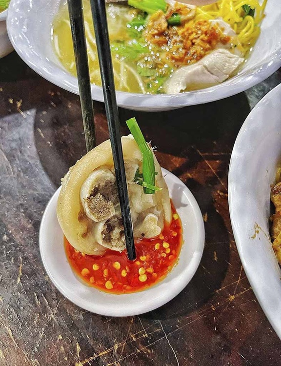 Hủ tiếu mì gà - lòng trứng, sa tế, tóp mỡ (Hủ tiếu khô + nước) |