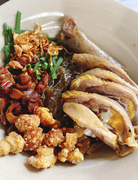 Hủ tiếu gà - lòng trứng, sa tế, tóp mỡ (Hủ tiếu khô + nước) |