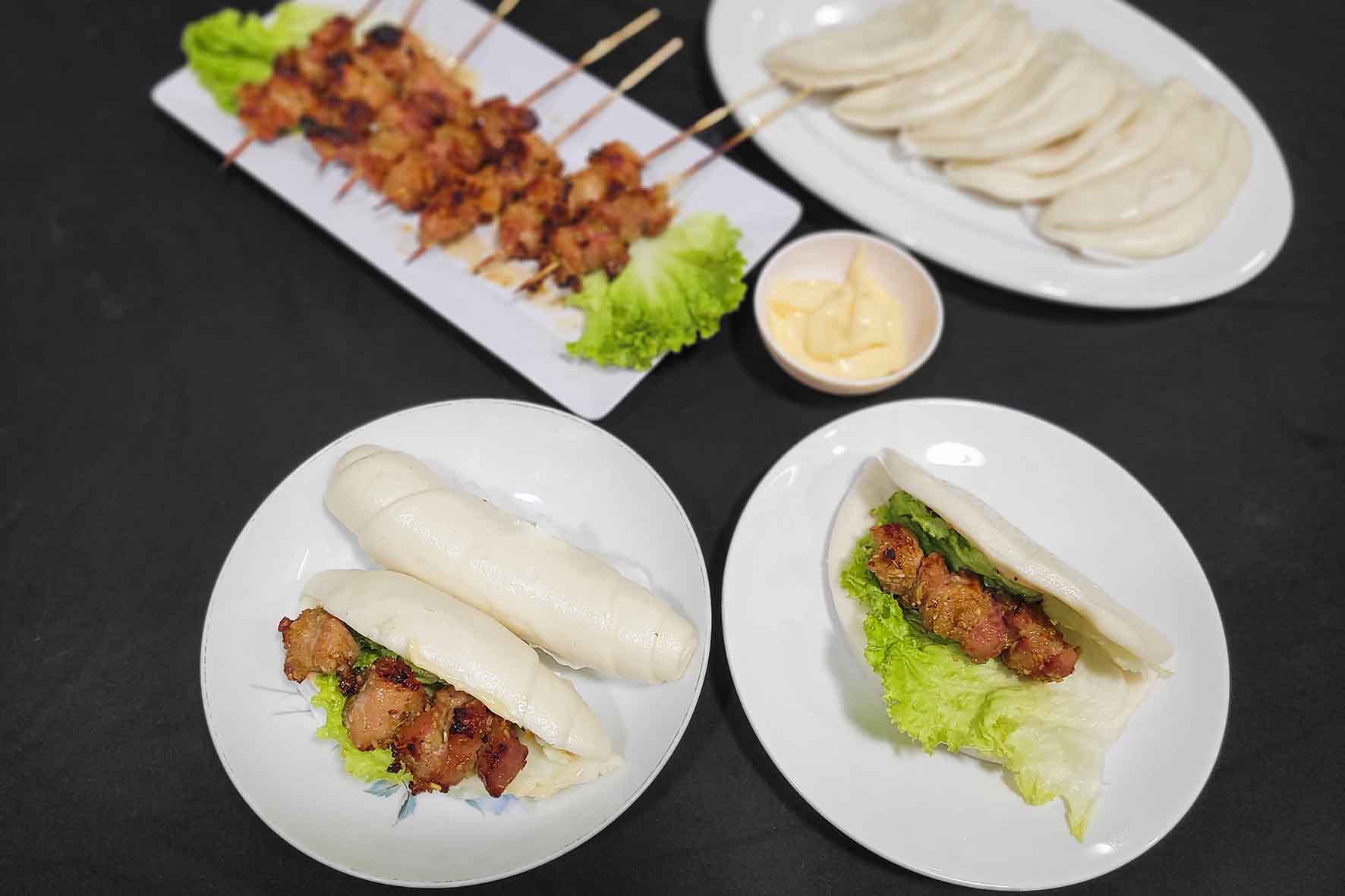 Món ăn đường phố lạ miệng, dễ thu hút khách. Bánh bao mềm nóng kết hợp thịt nướng xiên thơm lừng, ăn kèm rau và nước sốt đậm đà tạo nên món ăn nhanh hấp dẫn. Phù hợp bán tại quầy ăn vặt, xe đẩy, chợ đêm, khu công nghiệp hoặc bán mang đi