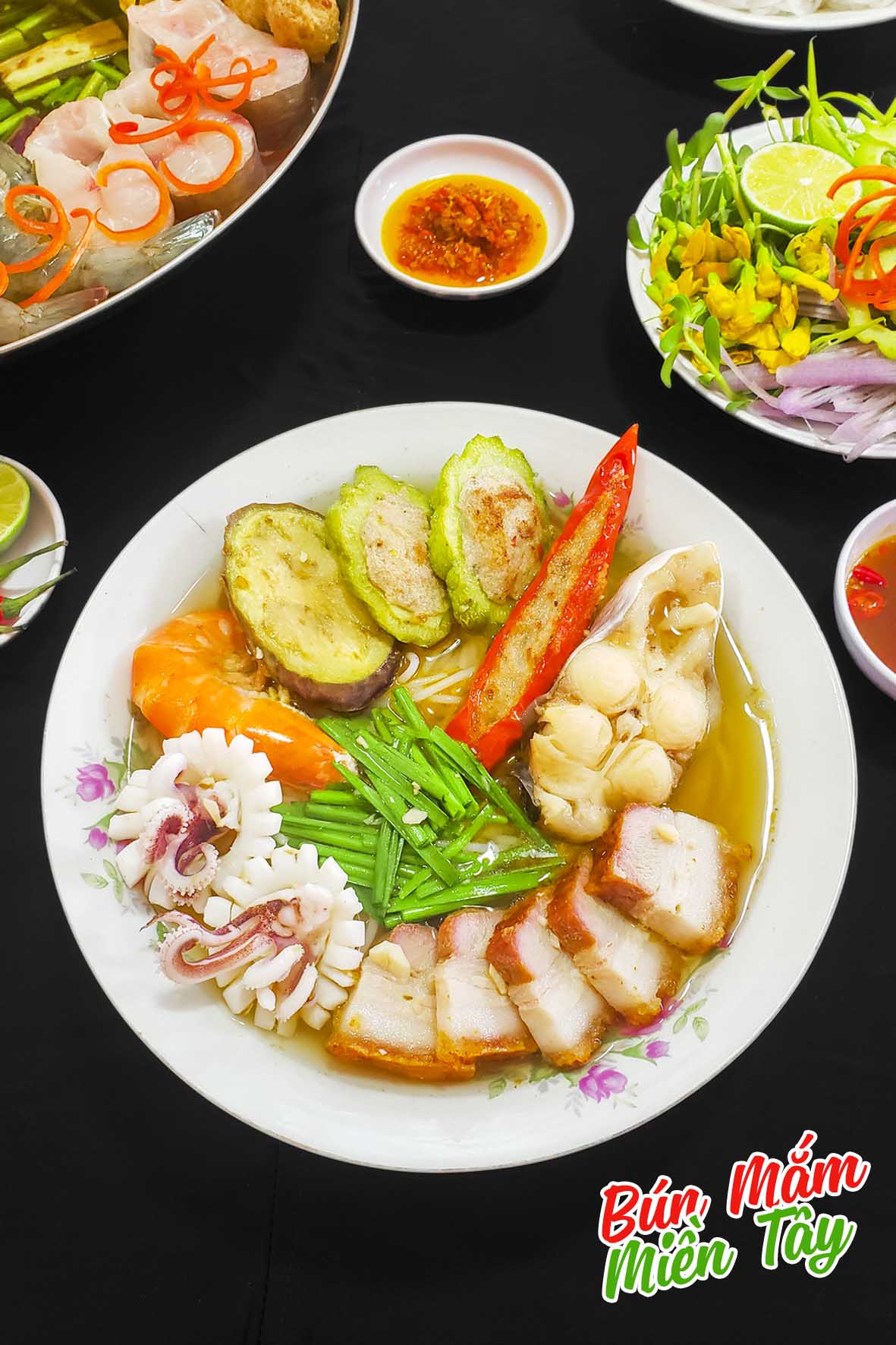 Nói đến Lẩu mắm, chắc hẵn ai cũng biết đó là một món ăn ngon hấp dẫn của vùng sông nước Miền Tây. Với hương vị đậm đà từ sự kết hợp của các nguyên liệu dân dã như mắm, cá, mực, thịt, cà tím, và các loại rau. Nếu được ăn món bún mắm trực tiếp ở các tỉnh Miền Tây bạn còn được thưởng tức kèm các loại ra đặc trưng nhu Bông Súng, Điên Điển, Kèo Nèo,...