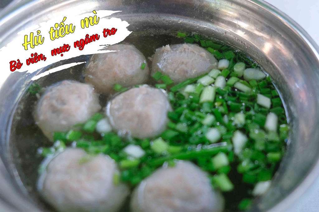 | Hủ tiếu bò viên thập cẩm: bò viên, mực ngâm nước tro, đậu hũ nhồi thịt, bì nổ |