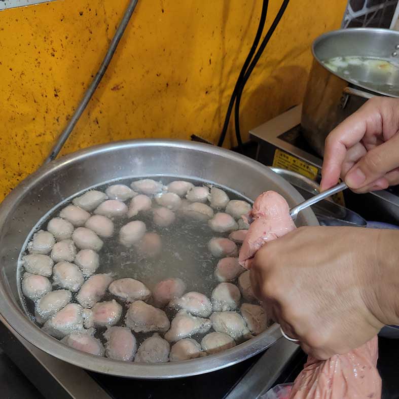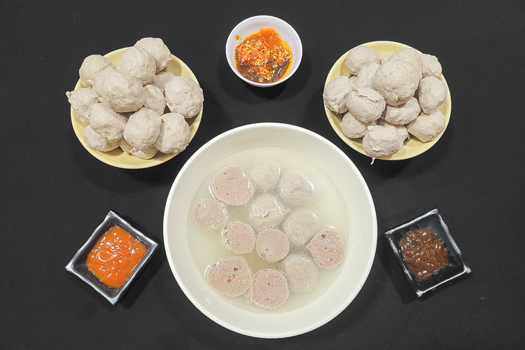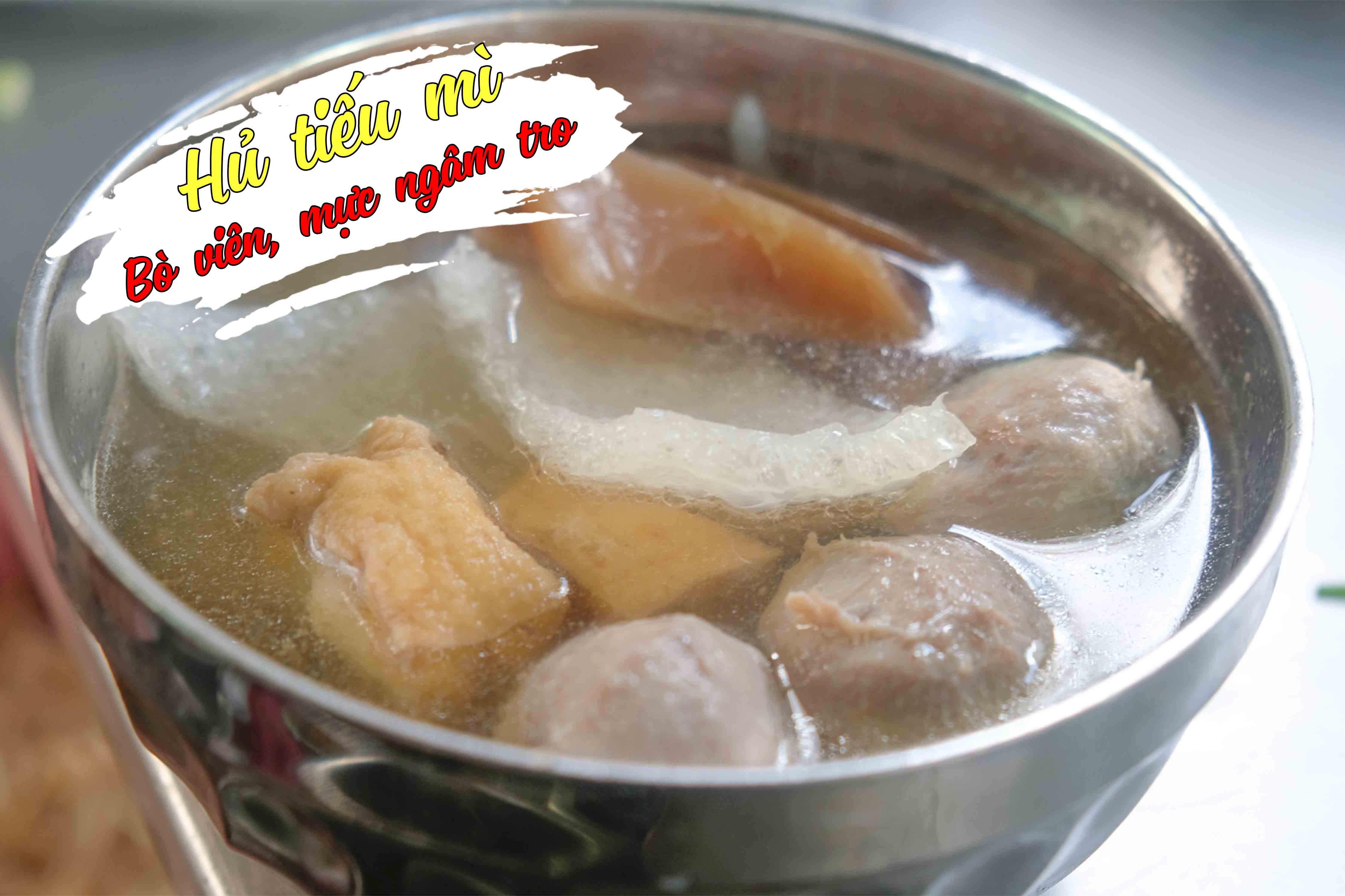 | Hủ tiếu bò viên thập cẩm: bò viên, mực ngâm nước tro, đậu hũ nhồi thịt, bì nổ |