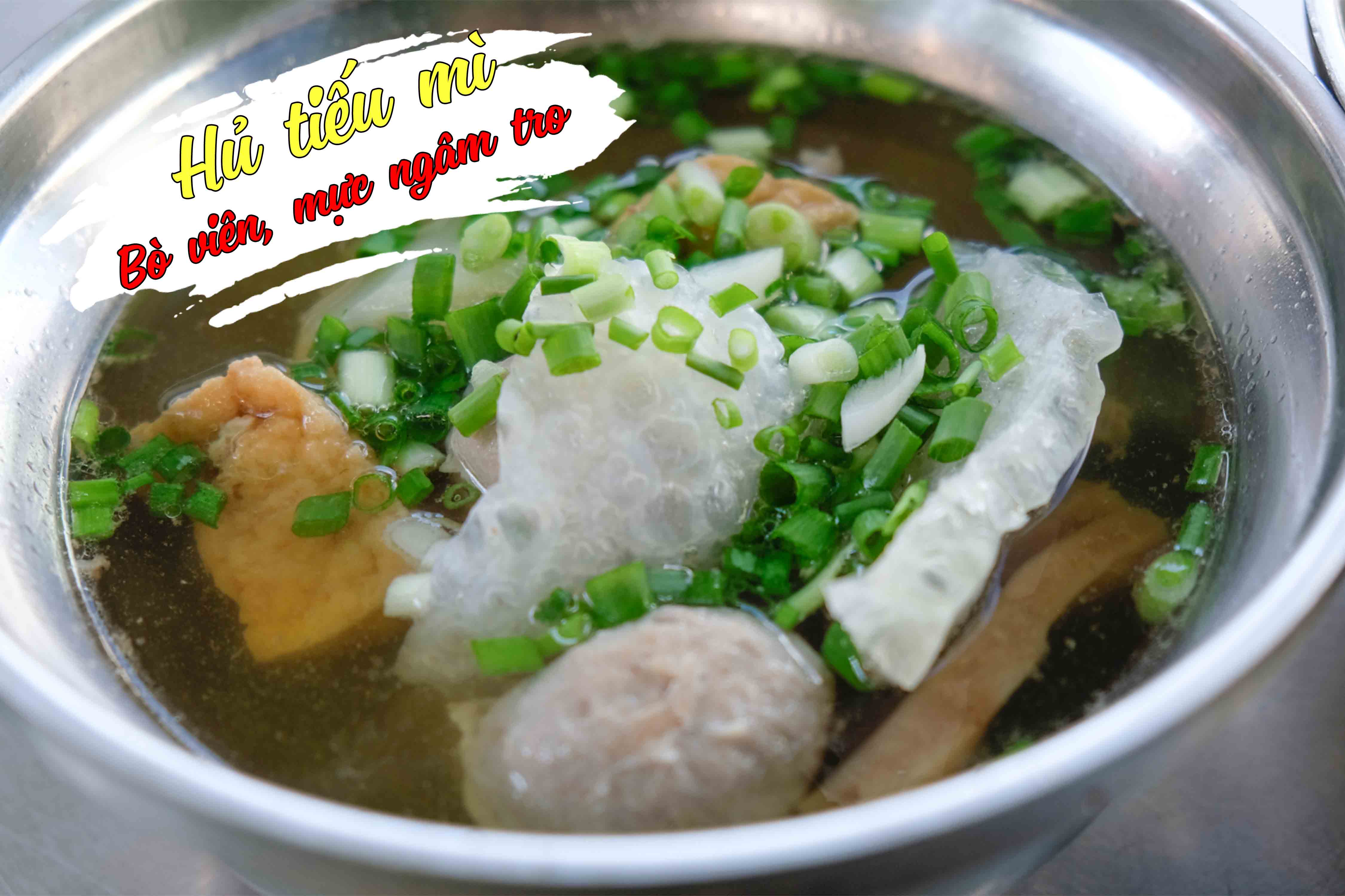 6.Đặc biệt: Hủ tiếu bò viên hay hủ tiếu thập cẩm gốc Hoa. Điểm khác biệt giữa hủ tiếu bò viên thông thường với hủ tiếu bò viên gốc Hoa chính là da heo phồng và đặc trưng của món chính là mực ngâm nước tro tàu. Đây là món chế biến từ mực đặc trưng của người Hoa, có màu nâu nhạt, khi ăn cảm giác giòn sật rất thích thú.