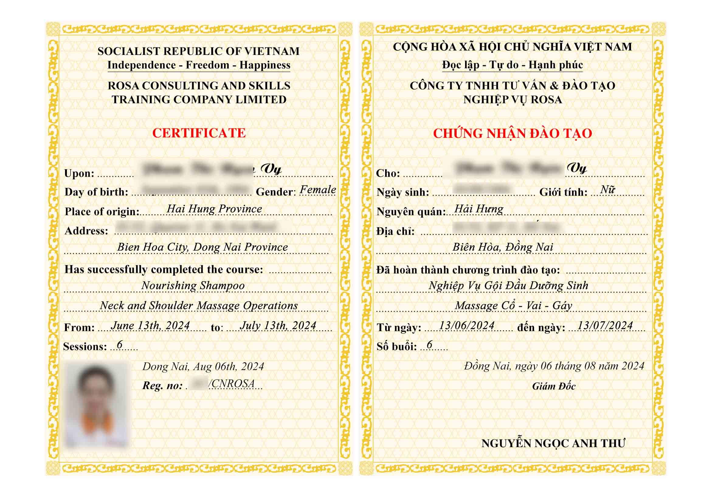 | Chứng Nhận Đào Tạo | Nghiệp Vụ Gội Đầu Dưỡng Sinh - Massage Cổ Vai Gáy | Nourishing Shampoo - Neck And Shoulder Massage Operations |