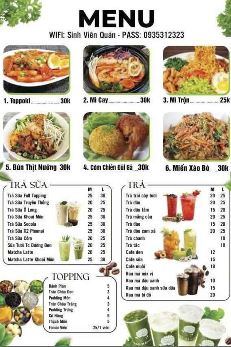 Thông tin liên hệ quán Sinh Viên Quán: - Địa chỉ: Số 38 Nguyễn Du, P. Trấn Biên, Đồng Nai (Đối diện Cao Đẳng Mỹ Thuật, đường vô Văn miếu Trấn Biên) - Số liên hệ đặt món: 0973406117 |