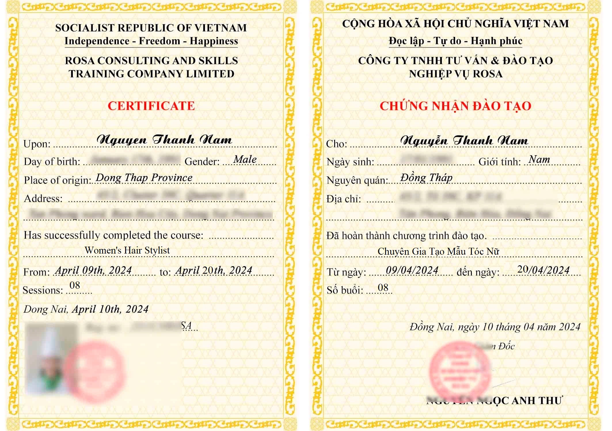 - Học xong được cấp chứng chỉ/chứng nhận: "SONG NGỮ" do Tổng Cục Giáo Dục Nghề Nghiệp cấp có giá trị toàn quốc, có thể mở tiệm, mở quán kinh doanh, xuất khẩu.