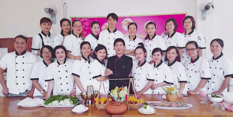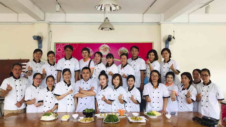 Chị LÊ NỮ HẠNH trong kỳ thi tốt nghiệp ĐẦU BẾP CHUYÊN NGHIỆP (Thứ 7 bên phải đếm qua)